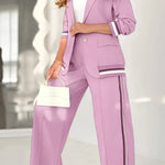 Fuse comfort and class with this sporty tailored co-ord set — featuring a sleek single-breasted blazer with striped cuff detail and relaxed wide-leg trousers. This two-piece outfit blends office-ready structure with casual comfort, making it perfect for smart-casual days, travel or on-the-go lifestyles. The stretch waistband and flowy fit offer maximum ease, while the blazer’s clean lines and athletic accents create a polished silhouette.
