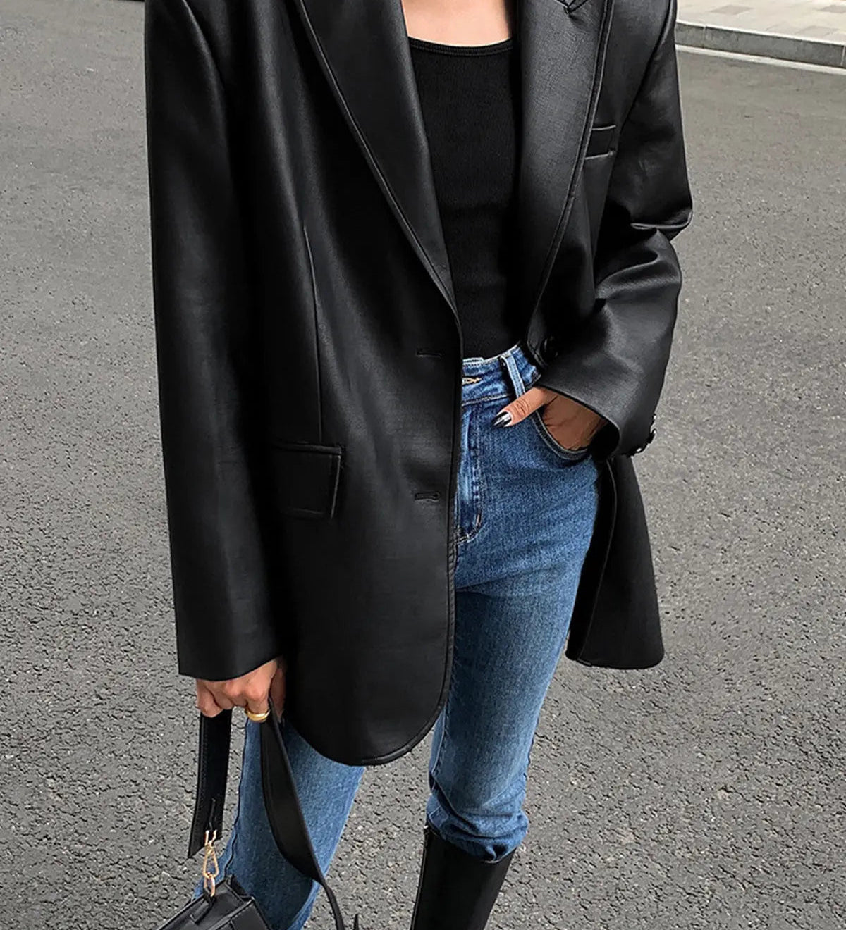Oversized Faux Leather Blazer with Sharp Tailoring and Street-Chic Edge