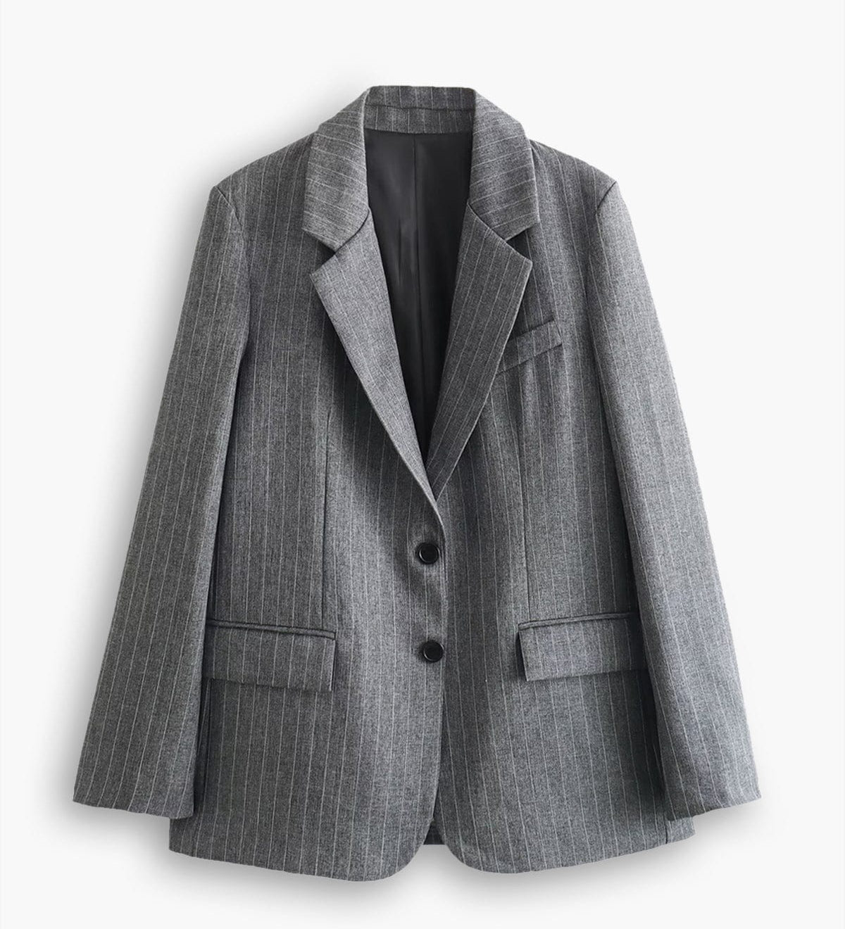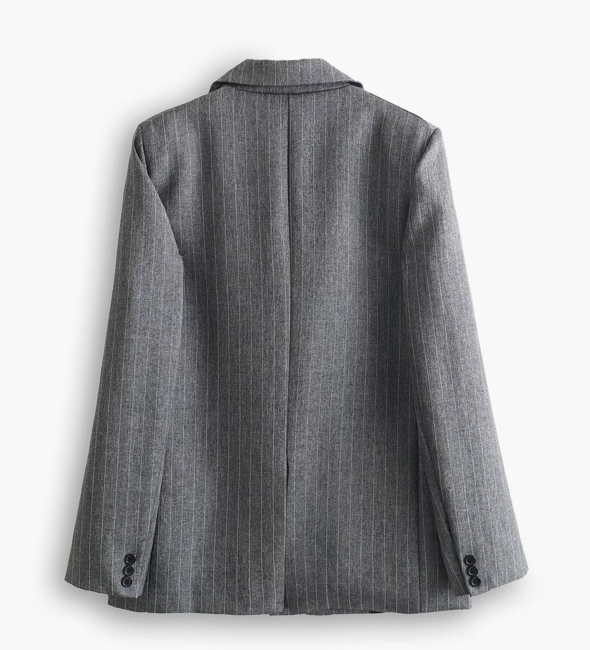 Classic Grey Pinstripe Blazer with Tailored Fit and Flap Pockets