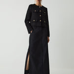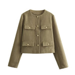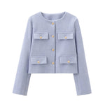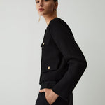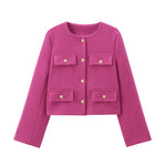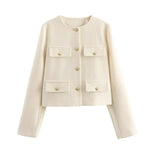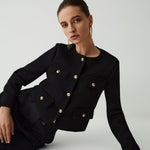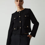 Enhance your wardrobe with timeless sophistication through this chic cropped jacket. Designed with elegant gold-tone buttons and four front pockets, this piece perfectly balances structure and style. The minimalist round neckline and tailored cut make it ideal for both smart and casual outfits. Whether paired with high-waisted trousers or a sleek skirt, this jacket adds a refined touch that transitions seamlessly from day to evening. Crafted for the modern individual who values effortless elegance and versatility.