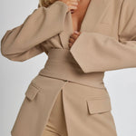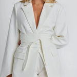 Refine your wardrobe with this tailored belted blazer — a structured yet feminine piece designed to accentuate your waist. Featuring wide lapels, a longline cut and a detachable belt, this blazer balances classic tailoring with contemporary minimalism. Ideal for both smart office looks and elevated casualwear, it pairs effortlessly with trousers, heels or trainers. A must-have staple for the modern woman.