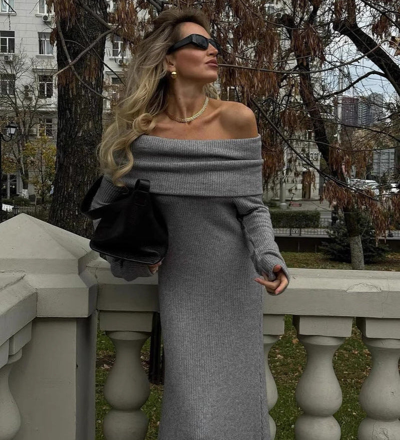 Off-Shoulder Ribbed Knit Maxi Dress for Women – Elegant & Cozy Fit