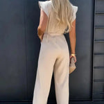 This elegant ruffle sleeve belted jumpsuit redefines modern sophistication with its graceful silhouette and flattering fit. The softly draped sleeves add a romantic touch, while the adjustable waist tie accentuates your figure beautifully. Designed with a wide-leg cut for comfort and movement, it offers a polished yet effortless look for any occasion — from brunch outings to evening events. Style it with heels and a clutch for a refined finish that exudes confidence and timeless charm.