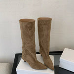 Step confidently into timeless sophistication with these elegant knee-high kitten heel boots. Designed with a sleek pointed toe and graceful silhouette, they blend classic charm with modern refinement. The soft texture and structured design create a flattering fit that elongates the legs, while the low kitten heel ensures all-day comfort and poise. Ideal for pairing with dresses, skirts, or tailored trousers, these boots transition effortlessly from office hours to evening outings. Perfect for the autumn and winter seasons, they add an understated touch of elegance to every look.