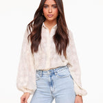 White Sheer Embroidered Floral Blouse with Balloon Sleeves