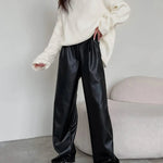 Elevate your street style with these High-Waisted Faux Leather Trousers in sleek black. Designed with a flattering wide-leg silhouette, these vegan leather pants combine minimalist chic with urban edge. The tailored high-rise waist and subtle pleats create a polished look, while the soft, leather-look fabric ensures comfort and mobility throughout your day.