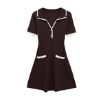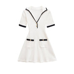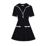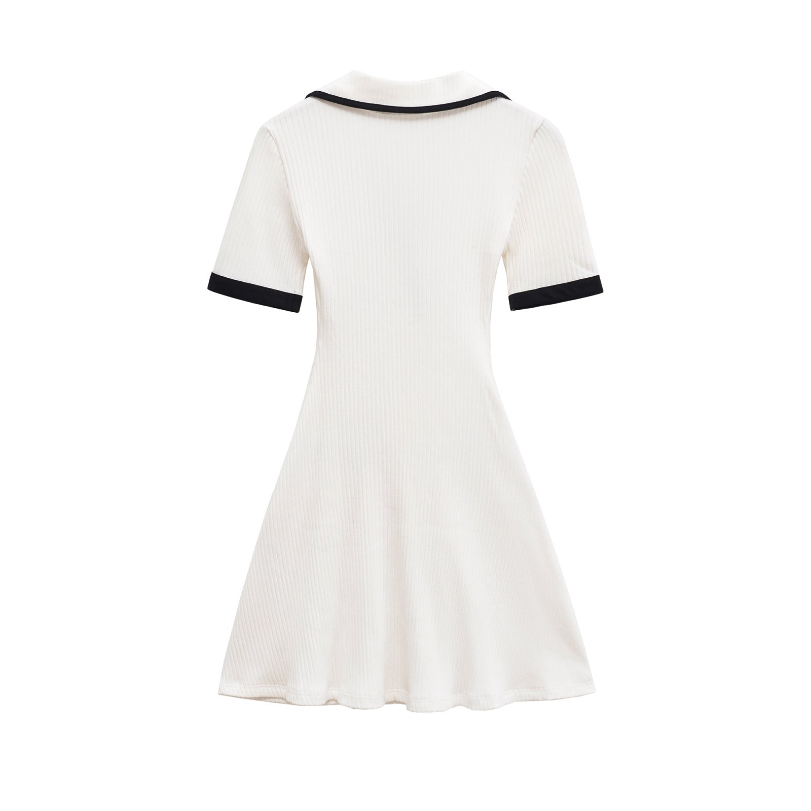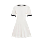 The short sleeves provide a balanced and versatile design, making this dress suitable for a variety of occasions throughout the year. Subtle contrast trim details along the neckline, sleeves, and waist add a stylish accent that elevates the minimalist design without overpowering it. The fitted waistline enhances your natural shape, while the softly flared mini skirt creates graceful movement and a feminine finish.
