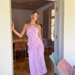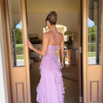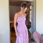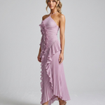 The elegant crossover halterneck adds a graceful, elongating neckline, while the flowing maxi length and asymmetric ruffle detail give this dress beautiful movement with every step. Whether you're attending a wedding, black-tie event, or special celebration, this is the dress that steals the show.