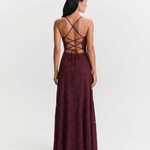 The elegant maxi length flows effortlessly to the floor, enhancing your natural shape and creating a statuesque look perfect for formal occasions. The delicate shoulder straps lead to a stunning open back design, adding a subtle yet captivating touch of allure. The crisscross strap detail enhances the overall aesthetic, balancing elegance with contemporary style.