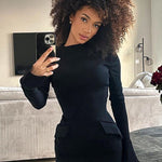 Step into timeless elegance with this navy bodycon mini dress. Designed to flatter the silhouette, it features a high neckline, long fitted sleeves with subtle flared cuffs, and sharp peplum-style flap details at the waist that enhance your curves. The clean, structured look offers effortless sophistication for any upscale event.