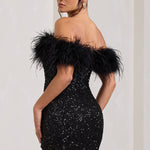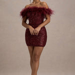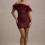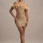 Off-Shoulder Sequin Mini Dress with Feather Trim