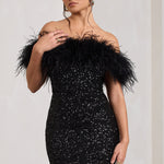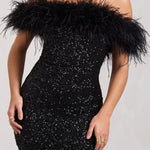 Elevate your evening look with this off-shoulder mini dress featuring a glamorous feather trim and shimmering sequin detailing. Designed for bold entrances and unforgettable exits, this body-hugging piece brings luxury and attitude together in one powerful silhouette.