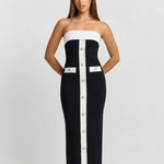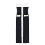 Make a bold and sophisticated statement with this strapless contrast panel maxi dress, designed to highlight your silhouette with modern elegance. Featuring a structured strapless neckline, this dress beautifully frames the shoulders and collarbone, creating a sleek and confident look. The striking contrast panel design down the front adds a contemporary edge, while the decorative button detailing enhances the tailored aesthetic.