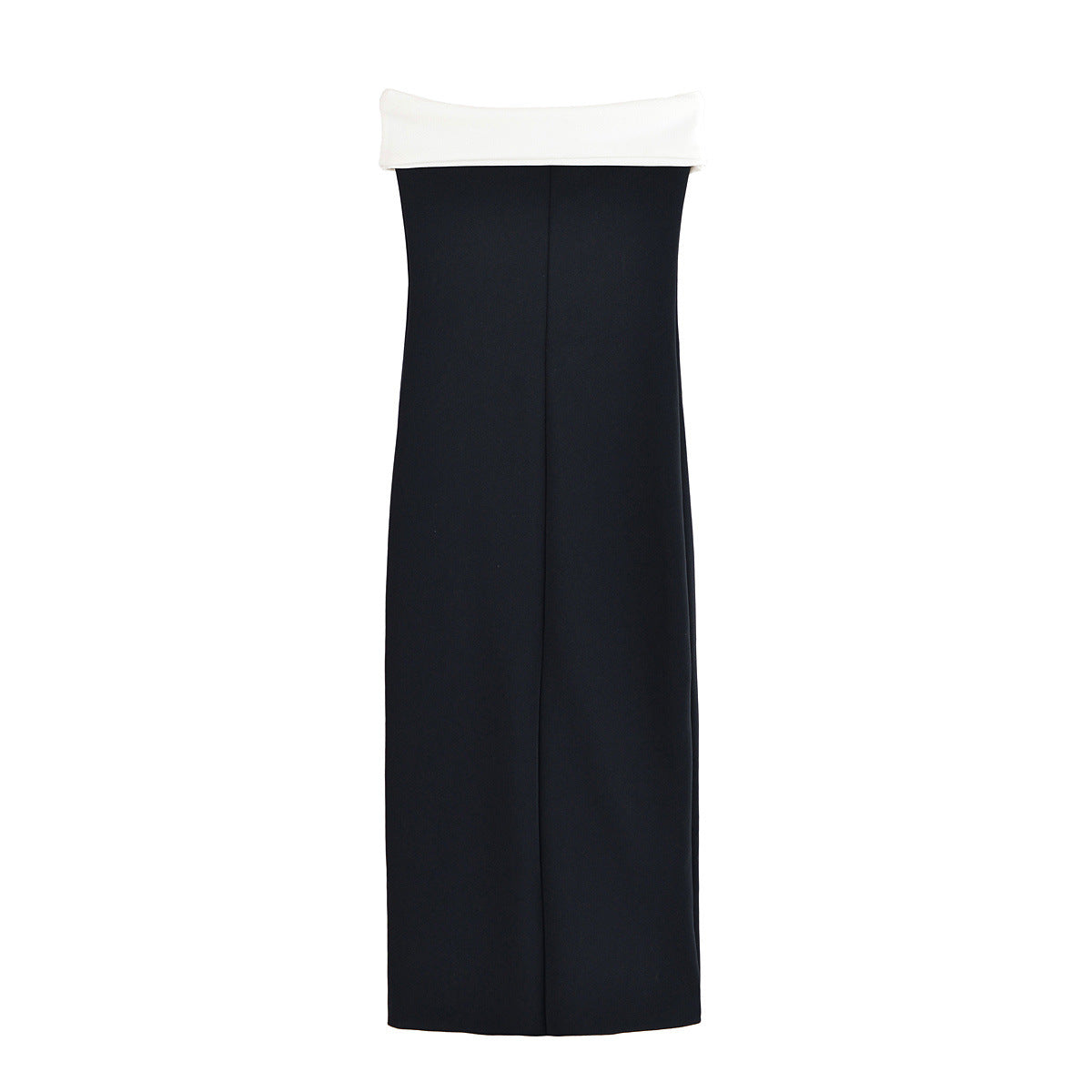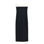 The fitted bodice contours the body, offering a flattering and sculpted shape that flows seamlessly into a floor-length skirt. The clean vertical lines elongate the figure, creating a refined and statuesque silhouette perfect for formal events, evening gatherings, and upscale occasions. The combination of minimalist structure and eye-catching contrast detailing makes this dress both timeless and fashion-forward.